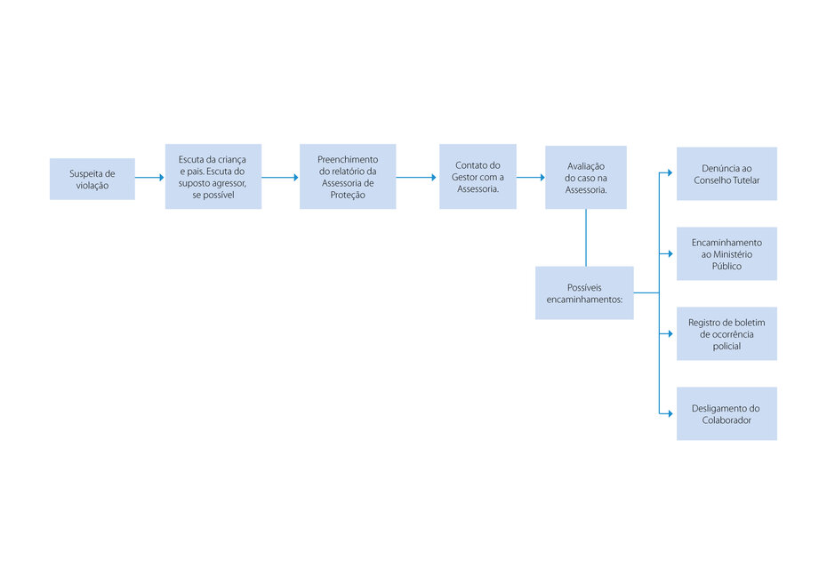 De acordo com as Políticas Institucionais de Proteção à Criança e ao Adolescente da Rede Marista, o representante legal da Unidade é o Coordenador Local de Proteção, tendo o papel de cumprir com as Políticas de Proteção, bem como levar ao conhecimento da Assessoria de Proteção da Rede os casos que envolvam violações dos direitos das crianças e dos adolescentes, devendo acolher a situação e fazer os encaminhamentos em sintonia com as disposições legais e institucionais.